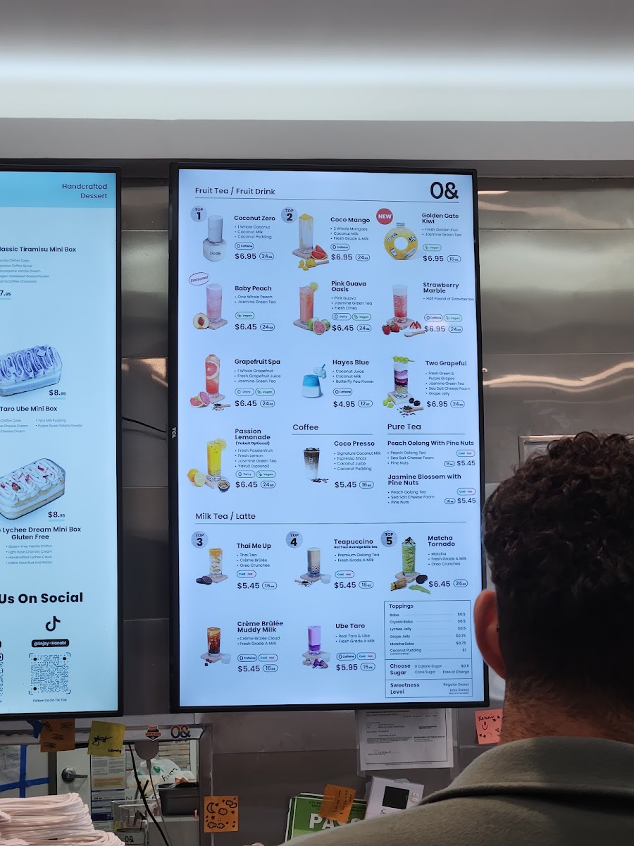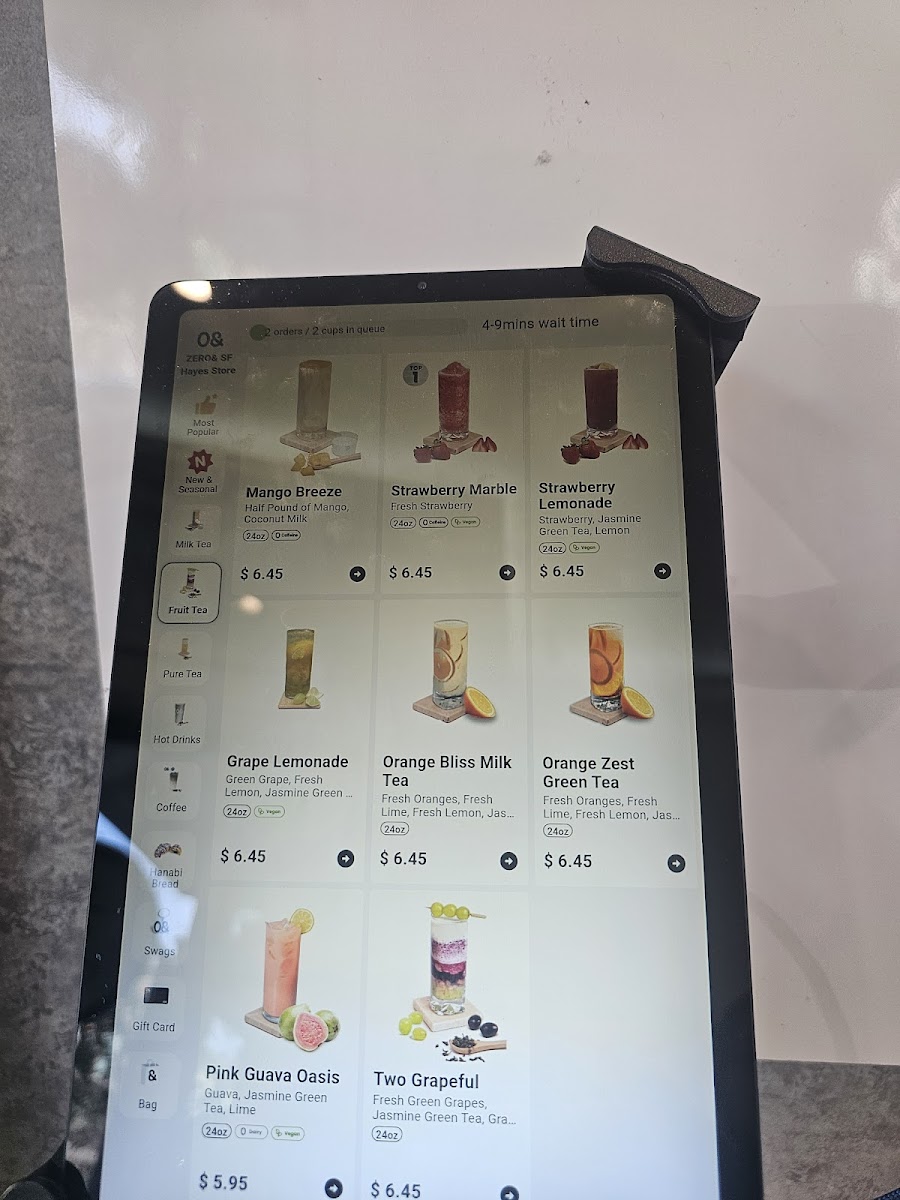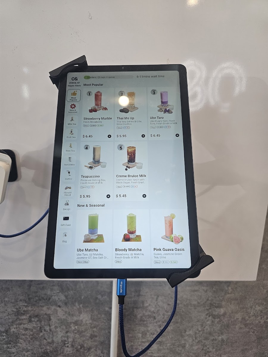 From a reviewer’s perspective, the menu at Zero& Sf Hayes Store offers a creative and diverse drink selection alongside unique pastries and branded merchandise, making it more than just a typical tea shop. The Fruit Tea section features refreshing options like Strawberry Marble, Strawberry Lemonade, and Grape Lemonade, while the Milk Tea lineup stands out with inventive flavors such as Ube Matcha, Bloody Matcha, Thai Me Up, Ube Taro, and Teapuccino. For those who prefer lighter flavors, the Pure Tea choices like Jasmine Green Tea, Peach Oolong Tea, and Osmanthus Oolong Tea provide fragrant alternatives, and the Hot Drinks menu includes comforting options like Hot Jasmine Milk Tea, Hot Osmanthus Oolong Tea, Hot Osmanthus Oolong Milk Tea, Hot Peach Oolong Milk Tea, and Hot Thai Me Up. Coffee lovers can try Coco Presso, while the Hanabi Bread selection adds a satisfying food component with pastries such as Chocolate Almond Croissant, Korean Garlic Bagel, Coconut Almond Croissant, Croque Monsieur Croissant, Not Your Average Ham Cheese, and Pandan Almond Croissant. The seasonal menu also brings interesting flavors like Mango Breeze, Concord Coco Crush, Strawberry Coconut Swirl, and Ube Coconut Dream, rounding out a menu that feels both playful and distinctive. Overall, the variety of teas, specialty drinks, and pastries makes the menu appealing for both adventurous and classic taste preferences.
