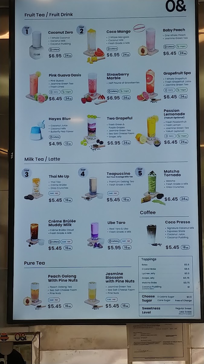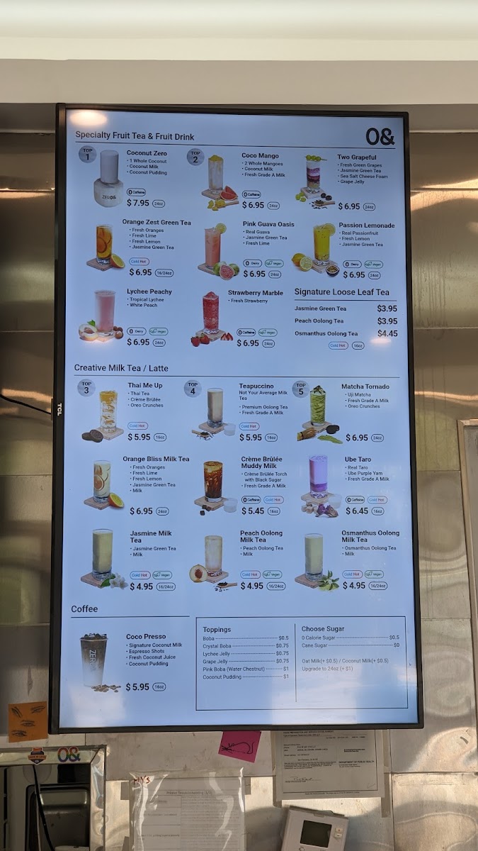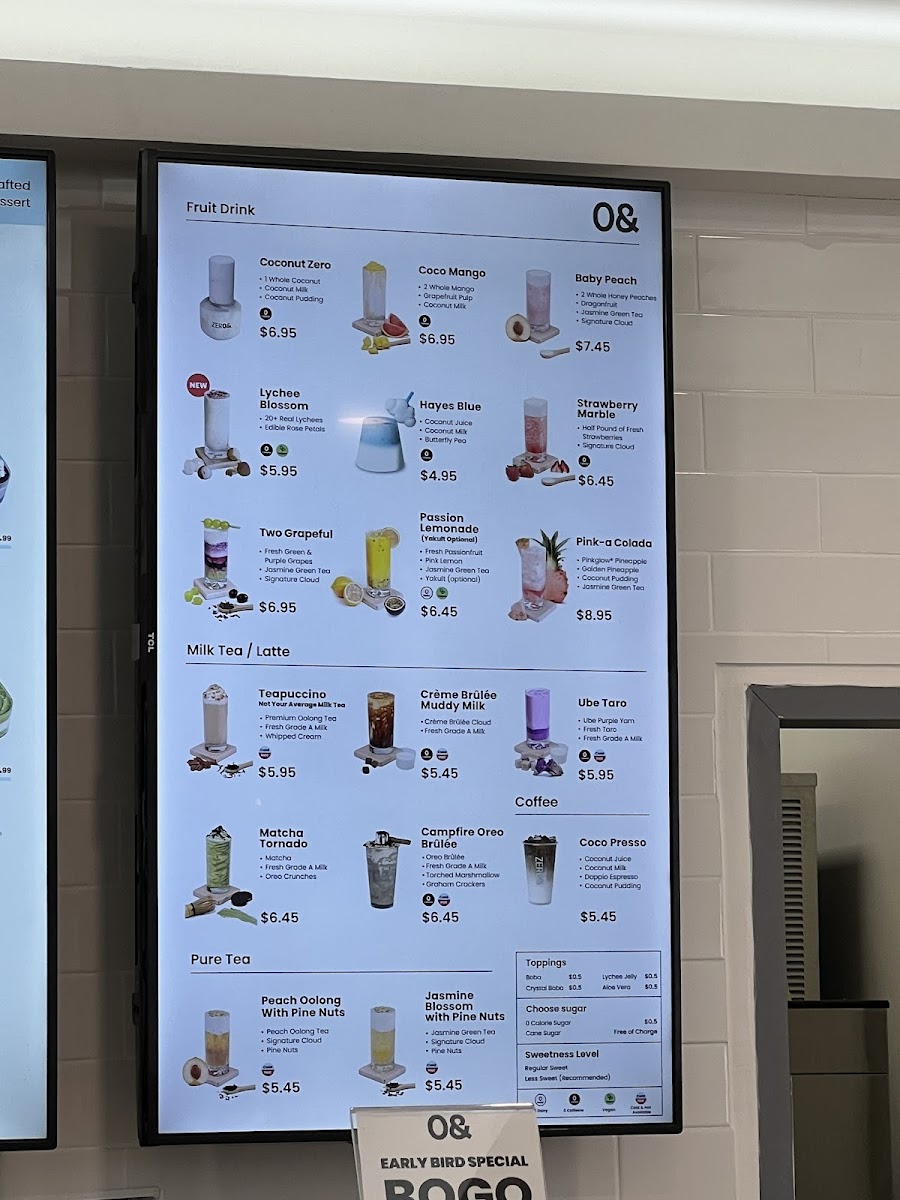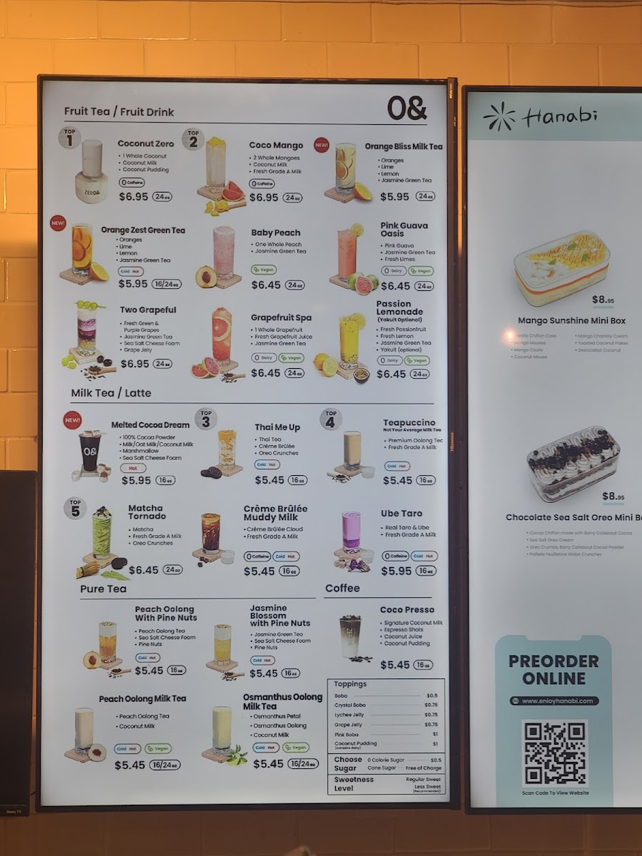 From a reviewer’s perspective, the menu at Zero& Sf Hayes Store offers a creative and diverse drink selection alongside unique pastries and branded merchandise, making it more than just a typical tea shop. The Fruit Tea section features refreshing options like Strawberry Marble, Strawberry Lemonade, and Grape Lemonade, while the Milk Tea lineup stands out with inventive flavors such as Ube Matcha, Bloody Matcha, Thai Me Up, Ube Taro, and Teapuccino. For those who prefer lighter flavors, the Pure Tea choices like Jasmine Green Tea, Peach Oolong Tea, and Osmanthus Oolong Tea provide fragrant alternatives, and the Hot Drinks menu includes comforting options like Hot Jasmine Milk Tea, Hot Osmanthus Oolong Tea, Hot Osmanthus Oolong Milk Tea, Hot Peach Oolong Milk Tea, and Hot Thai Me Up. Coffee lovers can try Coco Presso, while the Hanabi Bread selection adds a satisfying food component with pastries such as Chocolate Almond Croissant, Korean Garlic Bagel, Coconut Almond Croissant, Croque Monsieur Croissant, Not Your Average Ham Cheese, and Pandan Almond Croissant. The seasonal menu also brings interesting flavors like Mango Breeze, Concord Coco Crush, Strawberry Coconut Swirl, and Ube Coconut Dream, rounding out a menu that feels both playful and distinctive. Overall, the variety of teas, specialty drinks, and pastries makes the menu appealing for both adventurous and classic taste preferences.